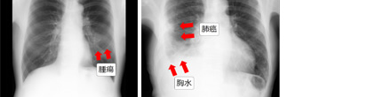 肺がんや肺結核、肺炎などでは、異常が白い影として映ります。気胸、肺気腫などは病気のあるところの空気が多くなるので、黒く映ります。気管支拡張症や胸水の有無なども分かります。